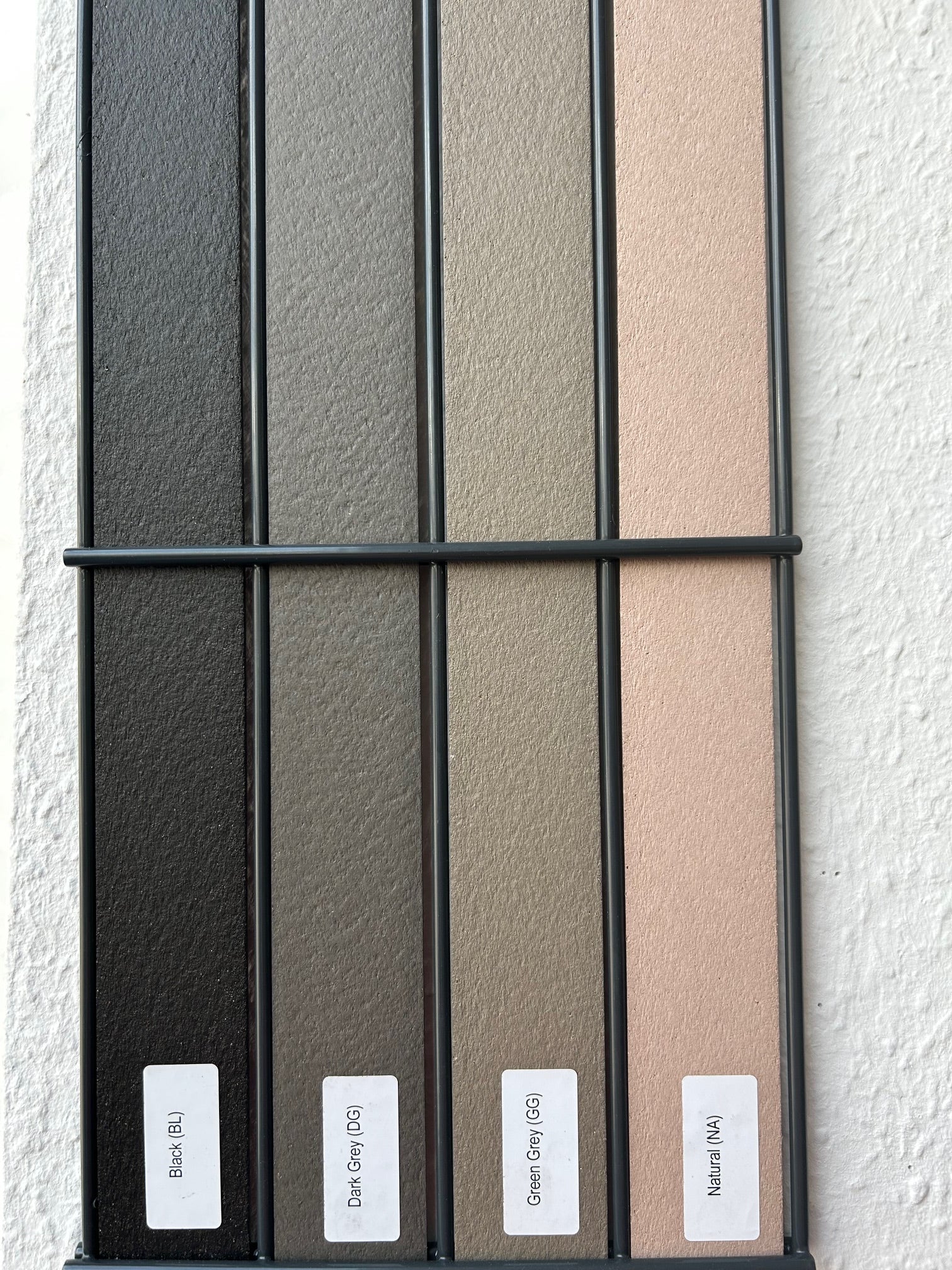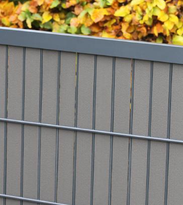Recycelte Verbundlatten (60% Reishülsen, 40% PVC, Stärke 2,8 mm). Nur für pulverbeschichtete Doppelstabmatten 6/5/6, senkrechte Montage.
